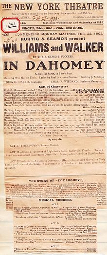 The day was February 18, 1903, and “The Great White Way” was getting a major upgrade with the premiere of Broadway’s first Black musical. Although there had been productions of musicals led by Black casts done prior, it wasn’t until this day that one had reached a major Broadway house. The musical comedy, In Dahomey, was the first of its kind to feature the talents of Black creatives on and off stage. The creative team consisted of music by Will Marion Cook, a book by Jesse A. Shipp, and lyrics by poet, Paul Laurence Dunbar.